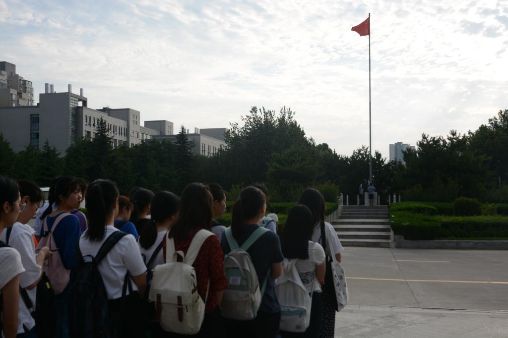 6月21日早晨6:50人文与外国语学院“国旗下的誓言”爱国主义主题教育系列活动在曲江校区主干道升旗台开展。2017级同学参加了此次活动。首先伴随着嘹亮的国歌声,鲜艳的五星红旗冉冉升起,在场同学全体肃立,向国旗行注目礼。