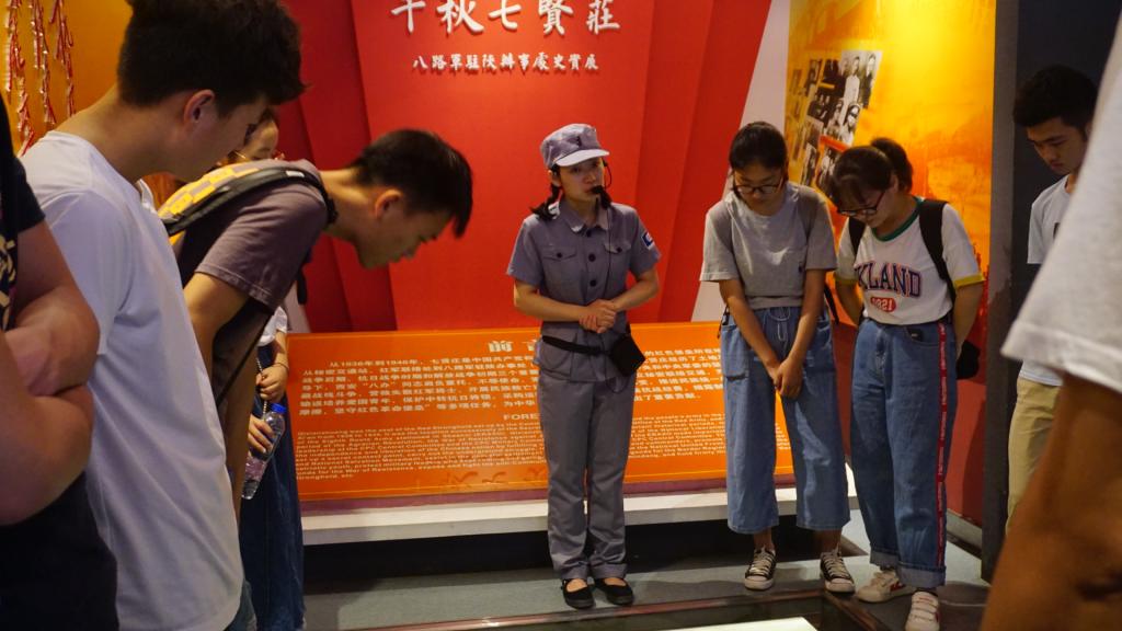 七贤庄内每一块绿砖墙瓦都彰显着抗日时期那段历史的厚重,每一颗参天的古木都在诉说着革命先烈可歌可泣的战斗经历。同学们时而停留在历史实物前讨论作用原理;时而驻足在历史照片前追忆往昔;时而在文字介绍前仔细阅读;时而为革命先烈的英勇事迹震撼不已,学习氛围热烈浓厚。