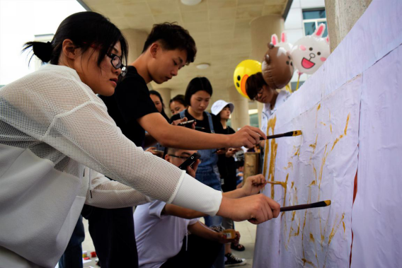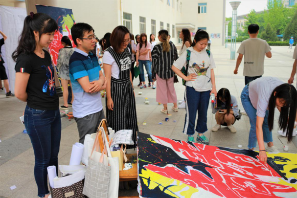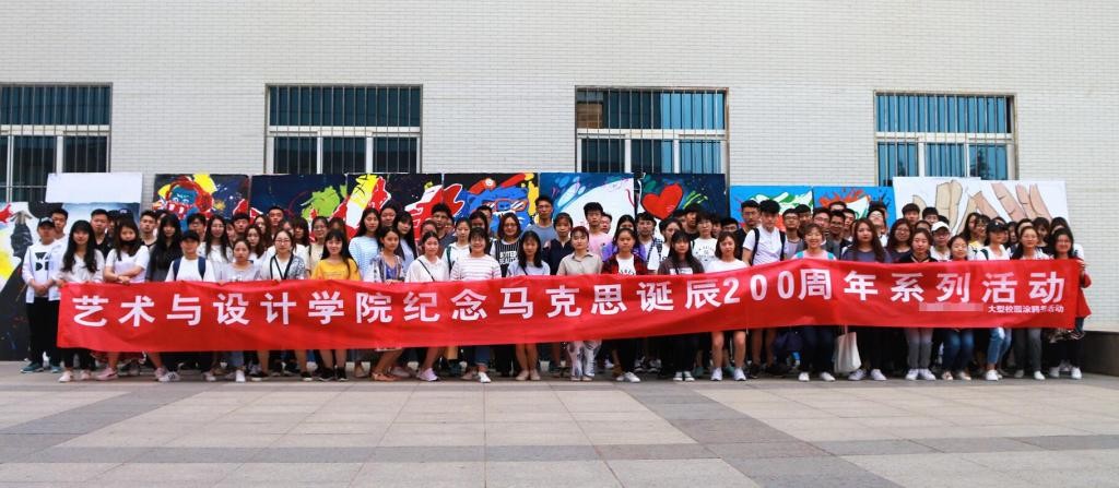 为纪念马克思诞辰200周年,展现新时代大学生青春活力,5月4日中午,艺术与设计学院在曲江校区逸夫科技信息馆广场举办以纪念马克思诞辰200周年为主题的大型校园涂鸦秀活动。院团委书记马欢老师、学工办主任何海生老师和全体辅导员以及大一学生参加了活动。